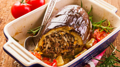 - Из баклажанов слить образовавшуюся воду, выложить в них полученную смесь так, чтобы часть овоща оставалась пустой. Таким образом во время приготовления набухающий рис не вывалится в форму. При желании баклажаны можно накрыть ломтиками помидоров.