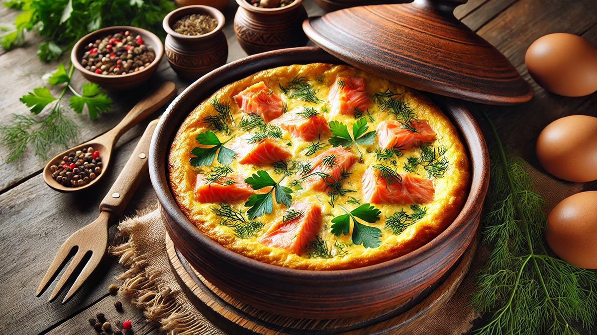 - Готовый омлет с горбушей украсить укропом. Подавать прямо в горшочке. Приятного аппетита!