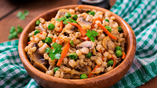 - Поместить горшочки в холодную духовку. Готовить перловую кашу с фасолью, овощами и грибами при температуре 180ºC в течение 20 минут. Подавать в горшочках или переложить на порционные тарелки.