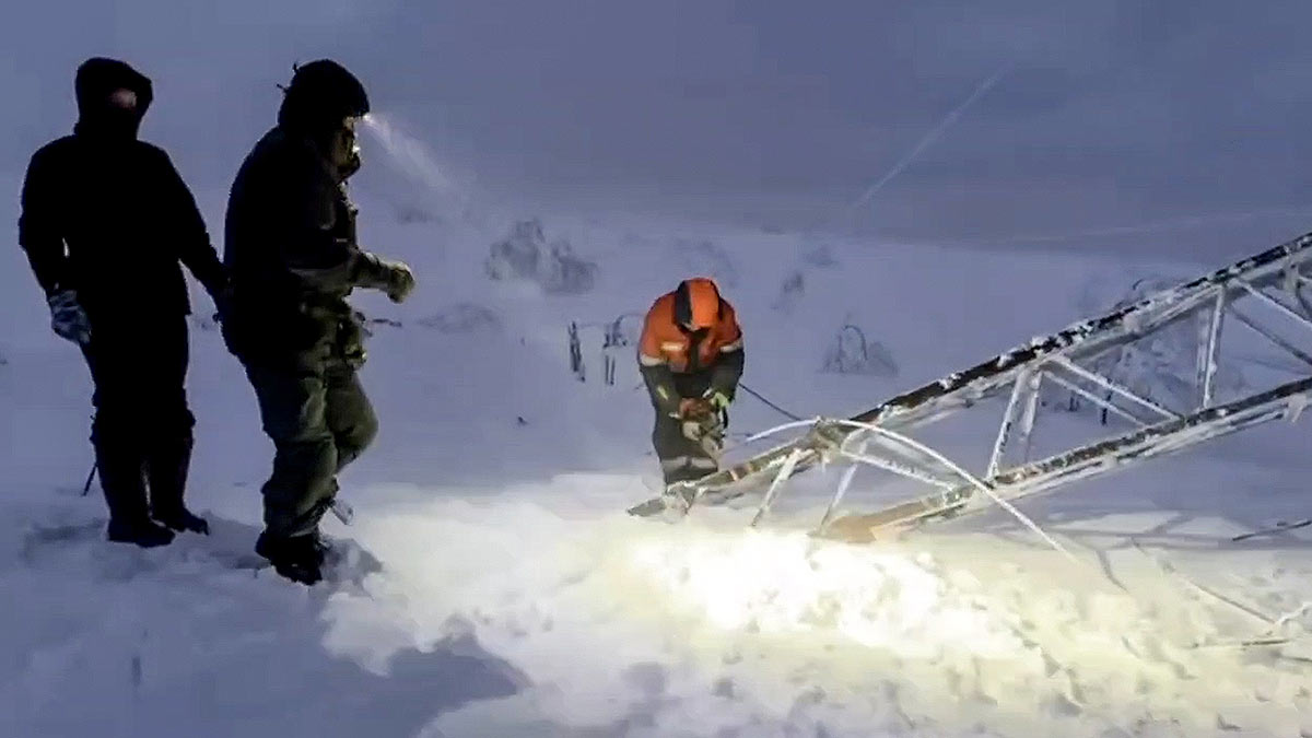 Россия. Мурманская область. Сотрудники СК РФ около обрушенной опоры ЛЭП
