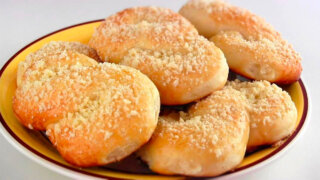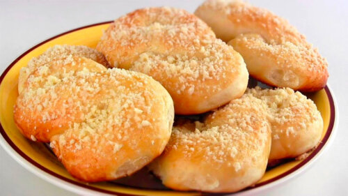 - Смазать булочки взболтанным желтком, посыпать сахаром и штрейзелем. Выпекать в разогретой до 180 градусов духовке 30 минут.