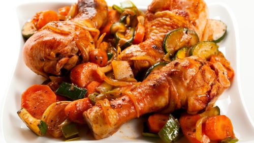 - Выложить сверху голени, немного утапливая их в овощи.
