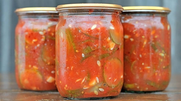 - Плотно разложите лечо с огурцами по сухим простерилизованным банкам и закатайте прокипяченными крышками.