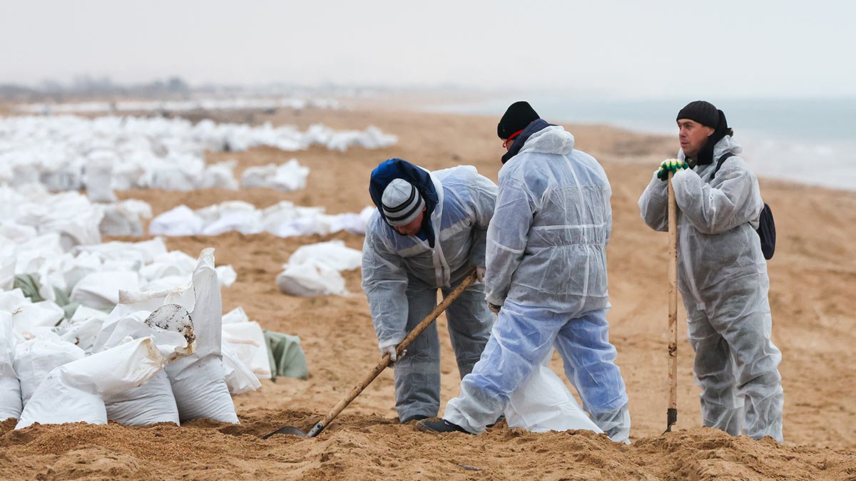 Волонтеры во время уборки разлитого мазута на пляже