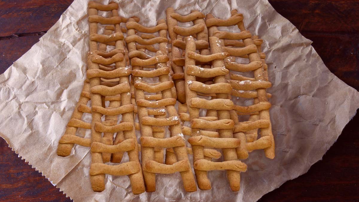 • Печь "лесенки" из текста, можно с семью ступеньками по числу добродетелей. Традиционно их пекли для каждого члена семьи, чтобы обеспечить здоровье и счастье, а также для домового. Лесенки освящали в храме. Молодые подбрасывали такие лесенки вверх (чья выше – к удаче) или подвязывали к веткам деревьев. Правда, если лесенка сломается при падении, это сулит несчастье.