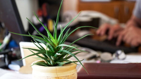Он может выжить даже в самых спартанских условиях, а разнообразие видов делает эти суккуленты украшением офисных интерьеров. Маленькие кактусы не занимают много места, не требуют особого ухода и легко поместятся на рабочем столе рядом с ноутбуком.