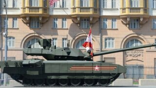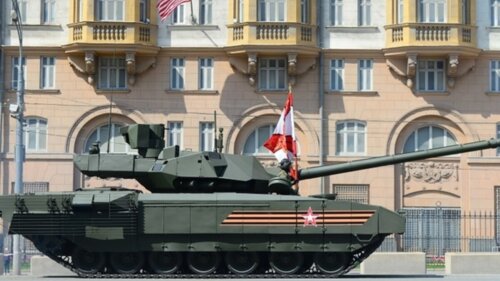 На ролике видна колонна машин Т-90М и Т-14 «Армата», проезжающая перед американским дипведомством. Движение для гражданского транспорта по Новинскому бульвару во время проезда техники было закрыто.