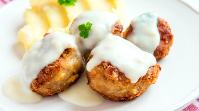 - На каждую тарелку выложите по 2 котлеты, картофельное пюре и гарнир из грибов. Полейте соусом из ряженки и подавайте сразу же.