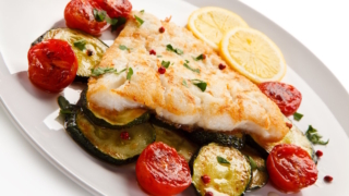 - Разогрейте духовку до 200°C. На противень положите двойной лист пергамента длиной 70 см. В центр выложите чередующиеся полоски сладкого перца и цуккини, слегка посолите и полейте оставшимся маринадом. Сверху выложите филе трески.