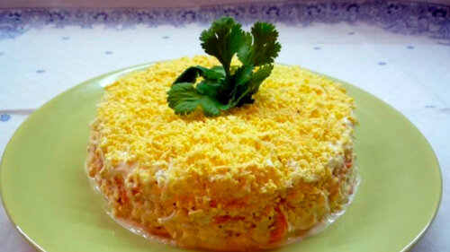 - Промазываем салат со всех сторон оставшимся майонезом с сыром. Посыпаем натертым желтком и отправляем в холодильник на час.
