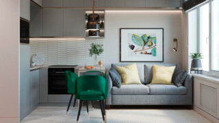 Этот прием поможет растворить в пространстве громоздкие предметы, в том числе фасады встроенных шкафов. Когда дело касается дивана, достаточно подобрать похожий оттенок обивки.
