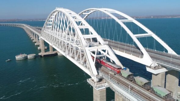 Уточняется, что по транспортному переходу пустили первые тяжеловесные составы с тепловозами. По данным ИЦ «Крымский мост», каждый состав состоит из локомотива и 23 вагонов-хопперов со щебнем весом 2,4 тыс. тонн.
