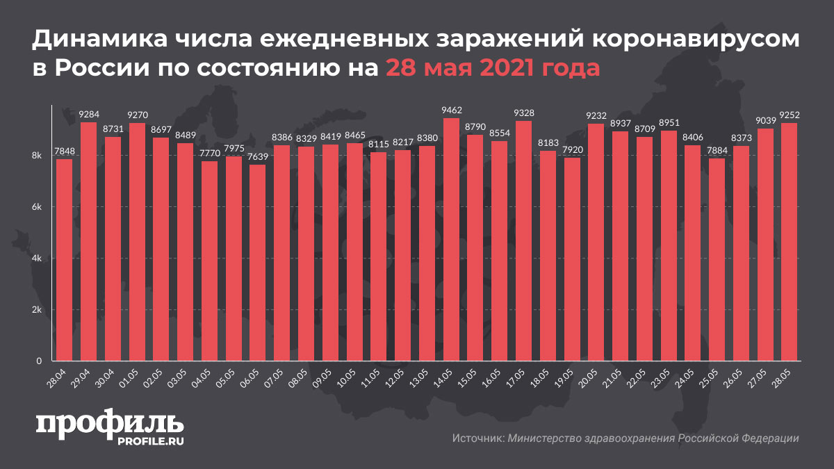 Наибольшее число заражений за сутки фиксируется в Москве. Там выявили 3274 новых случая COVID-19. После столицы в списке следует Санкт-Петербург, где коронавирус подтвердили у 840 человек. На третьем месте – Московская область с 746 новыми случаями инфицирования.