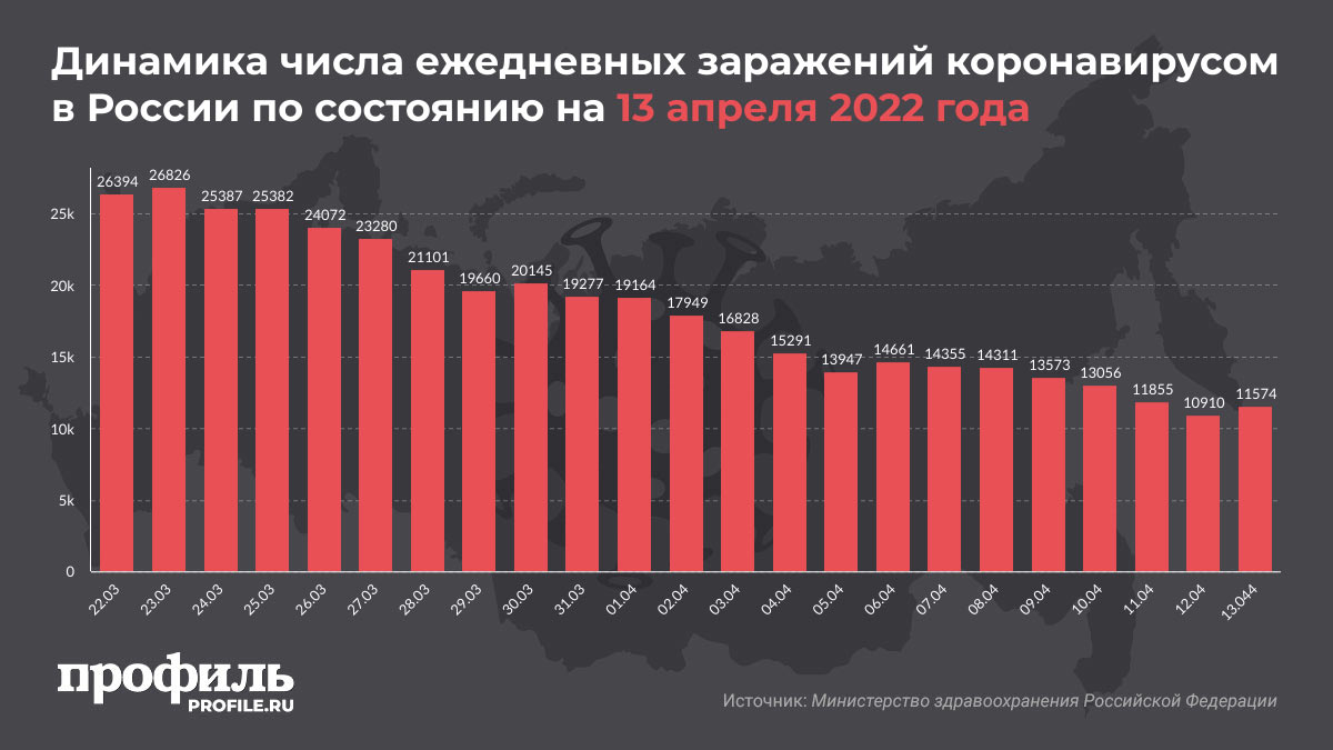 Динамика числа ежедневных заражений коронавирусом в России по состоянию на 13 апреля 2022 года