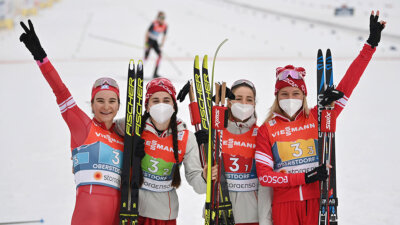 Честь страны защищали Яна Кирпиченко, Юлия Ступак, Татьяна Сорина и Наталья Непряева. Однако победа досталась представительницам Норвегии. Они преодолели дистанцию за 53 минуты 43,2 секунды. Бронзу взяли спортсменки из Финляндии. Их отставание от норвежек составило 46,2 секунду. Россиянки отстали от обладательниц золота на 26,6 секунды.