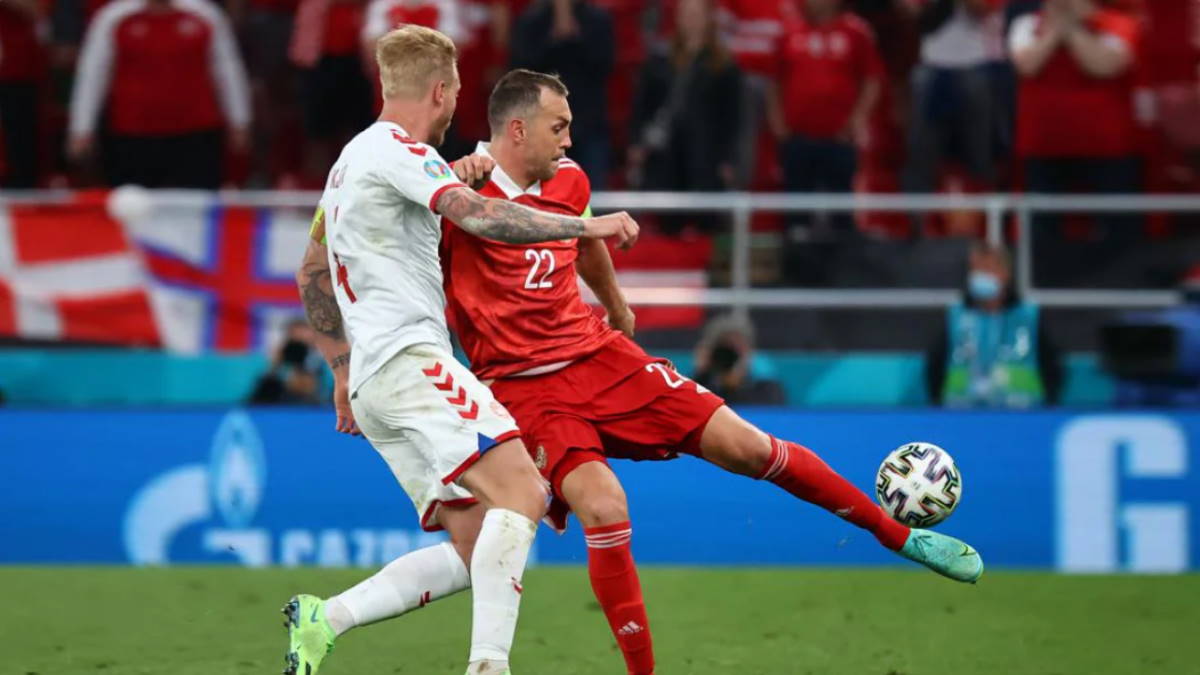 Счет в матче открыли противники россиян на 38-минуте. Первый тайм отметился только одним голом нападающего датской сборной Миккеля Дамсгора в ворота Матвея Сафонова. Во второй половине, на 59-й минуте, преимущество датчан удвоил нападающий Юссуф Поульсен.