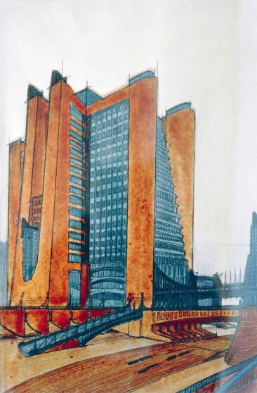 Antonio Sant’Elia/M. E. Smith/De Agostini Picture Lib./AKG-Images/Vostock PhotoТак возник «Новый город» Антонио Сант-Элиа (1914) – фантазия о мегаполисе, в котором здания являются узлами сети, регулярно обновляемой и перестраиваемой. В 1960-х советские архитекторы из группы НЭР («Новый элемент расселения») разработали концепт линейного города-реки («Русло расселения»), к которому примыкают жилые кластеры-притоки. А их английские коллеги из группы Archigram представили концепты надувного и шагающего городов.