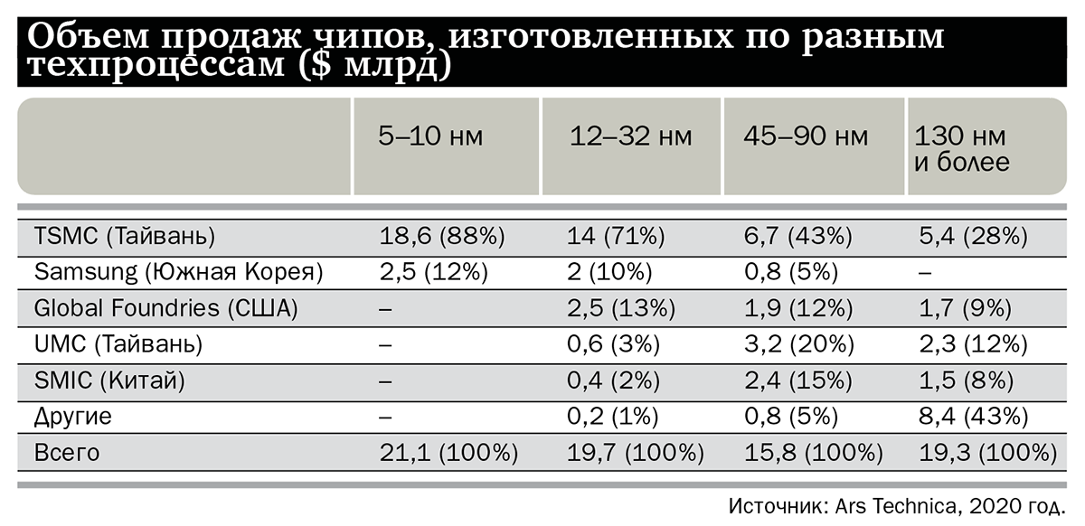 Эта ниша представлена компаниями UMC, SMIC и GlobalFoundries: последняя, например, официально отказалась от перехода на техпроцесс 7 нм (а недавно получила крупный заказ от Пентагона на чипы 45 нм). Да и у той же TSMC, судя по отчетности за первый квартал 2021 года, на долю чипов 28–250 нм пришлось 37% выручки.